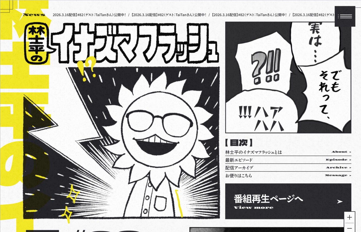 15つ目は、人気漫画『SPY×FAMILY』『チェンソーマン』『ダンダダン』などを手がける漫画編集者・林士平がパーソナリティを務めるポッドキャスト番組「林士平のイナズマフラッシュ」の公式サイトです。