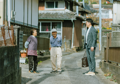 FVには、地域の人たちと話す、地域をくまなく歩いてまわる不動産部門の責任者の姿。いくつかの写真が遷移する中で、その担当者の横向きの立ち位置が変わらないような撮影に工夫しました。まるで、まちを歩きまわって見えるうように工夫しています。