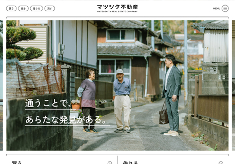 「通う」というキーワードをもとに、地域に通う担当者の姿をFVにしました。不動産会社のサイトの大きな役割である物件情報は、見やすく、探しやすく、理解しやすいシンプルに。だからこそ、最初にであうFV(=人)には血の通ったビジュアルにこだわりました。地域の人と話す、地域をくまなく歩いてまわる、そんな人柄が伝わるような建て付けにしています。