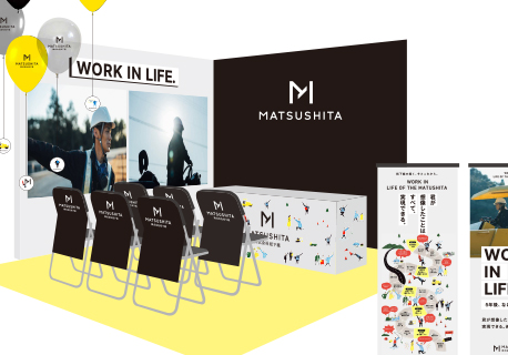 最初は「ウェブサイトをつくりなおしたい」「採用を強化したい」といったご要望でした。しかし、気づけば松下組全体を巻き込む一大プロジェクトへと成長。まず、軸となる松下組のコーポレートサイトは、綿密なヒアリングを経て「WORK IN LIFE」というスローガンに着地しました。「WORK IN LIFE」とは、代表の松下義一さんが語る「仕事が、人生に溶け込んでいることが理想」という思いを言語化したもの。このスローガンがチームみんなの道標となったことで、コーポレートサイト制作が軌道に乗り始めます。これを皮切りに、リクルート動画の制作やオリジナル商品の開発、70周年事業のロゴ制作、会社のMVV(ミッション・ビジョン・バリュー)策定にいたるまで発展。長い時間をかけ、ともに丁寧につくりあげてきました。